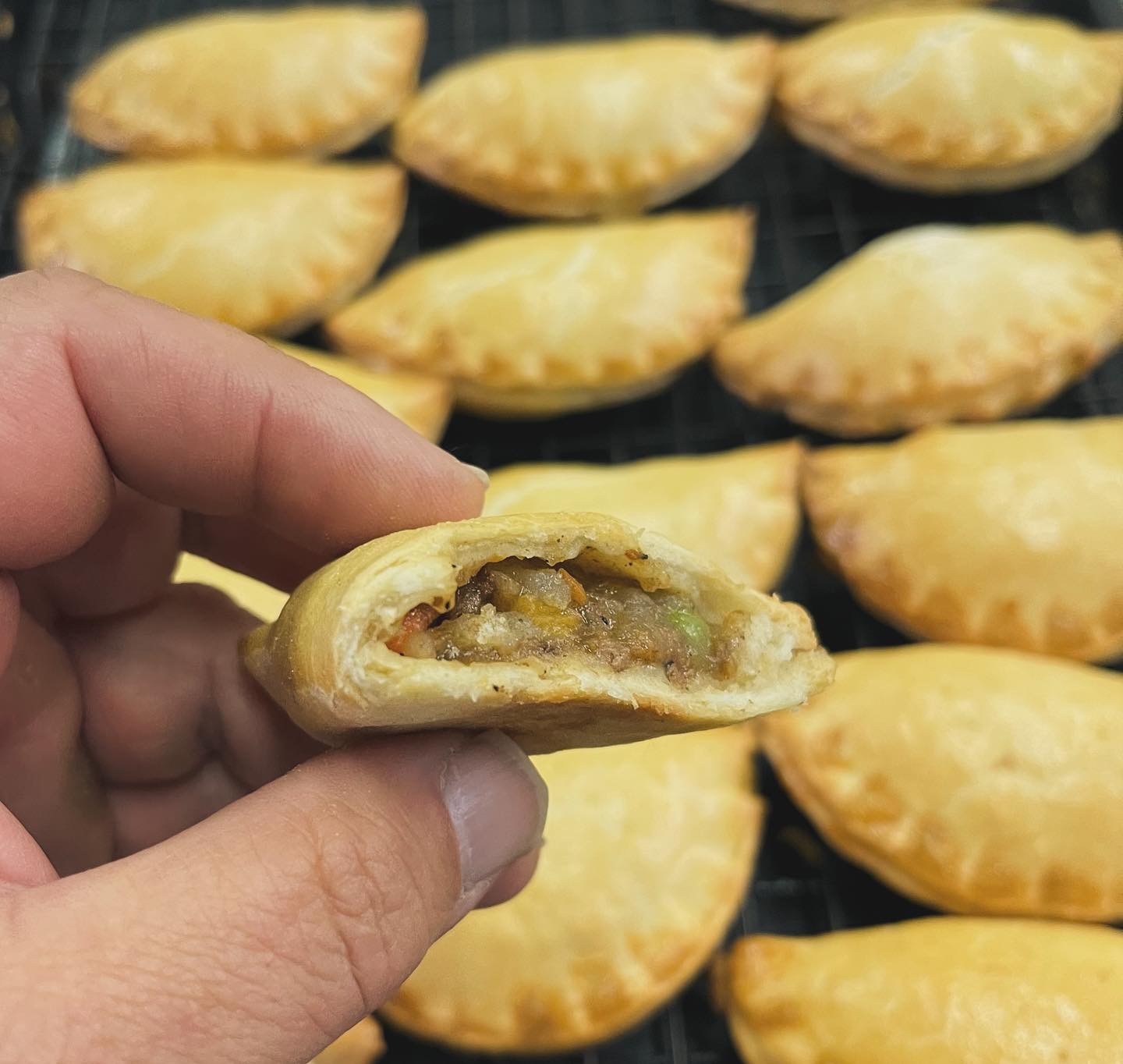 These mini legends are filled with seasoned beef, carrots, turnips, potatoes, sweet potatoes, and peas — wrapped in flaky, golden pastry just like the full-size version.